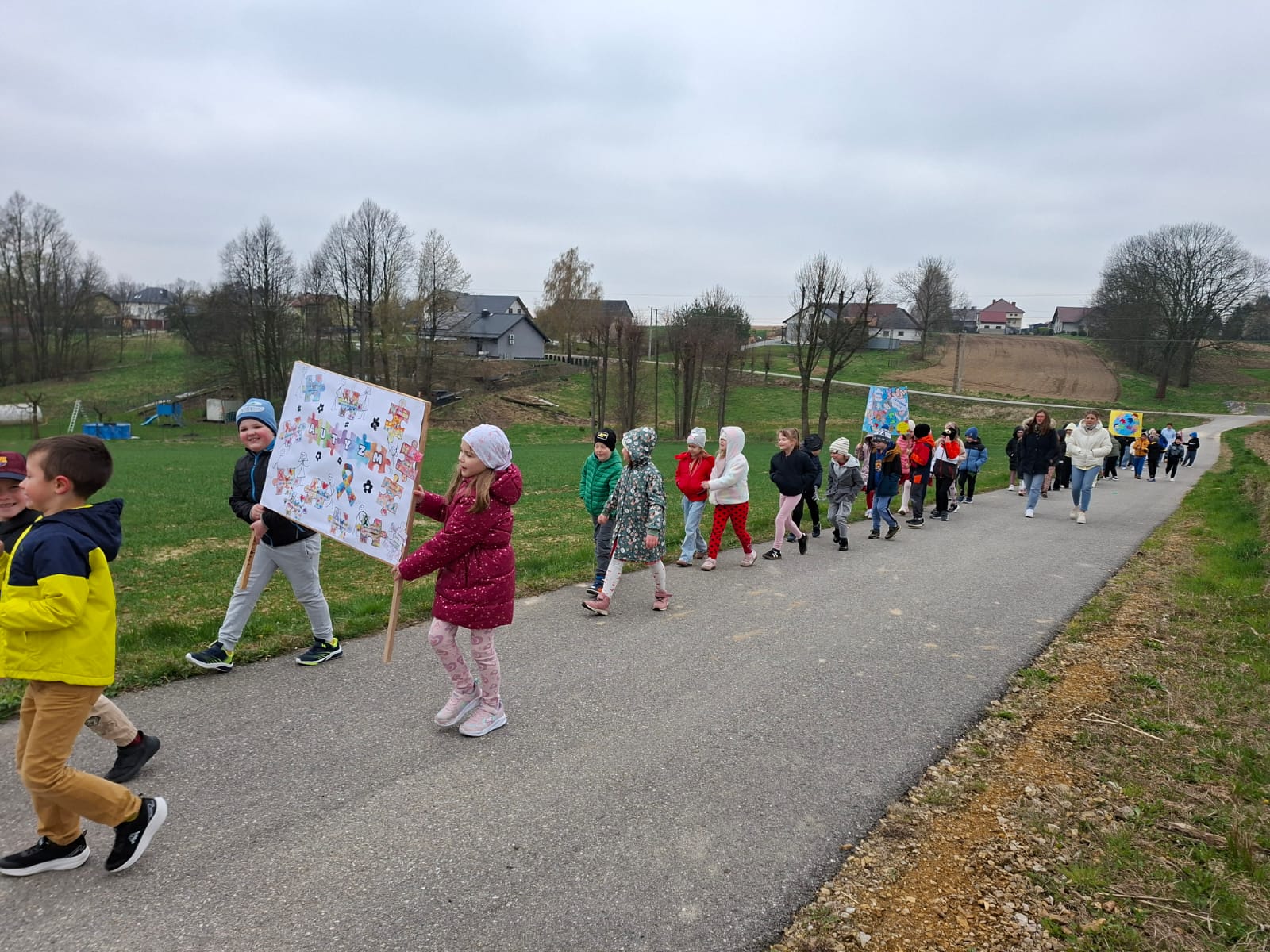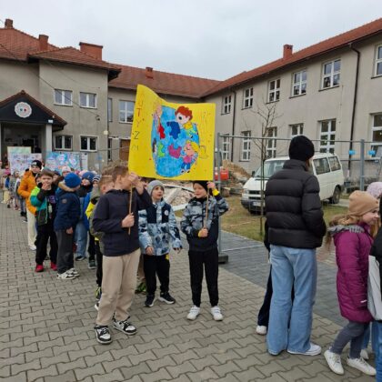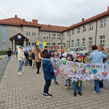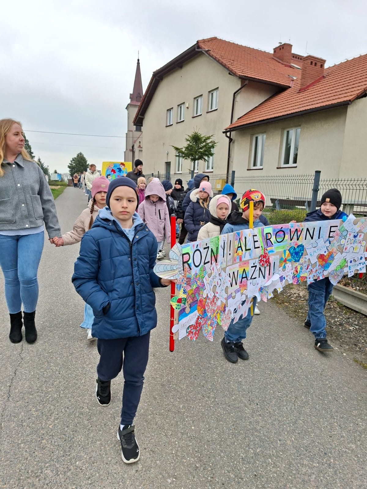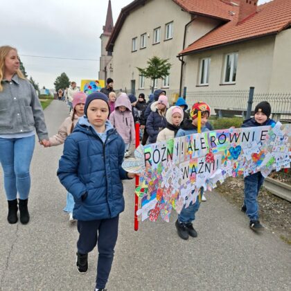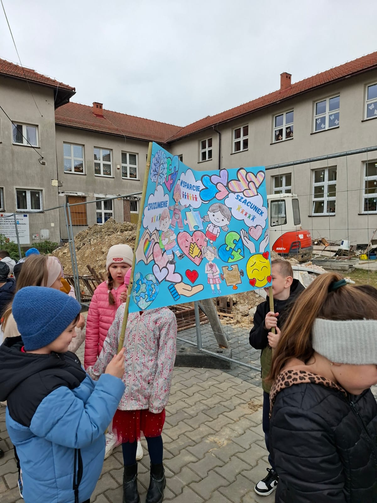 Po zakończeniu prac plastycznych cała społeczność szkolna wyruszyła na wspólny spacer po okolicy. Chcieliśmy w ten sposób pokazać nasze wsparcie i zwrócić uwagę mieszkańców na to, jak ważna jest otwartość na drugiego człowieka.