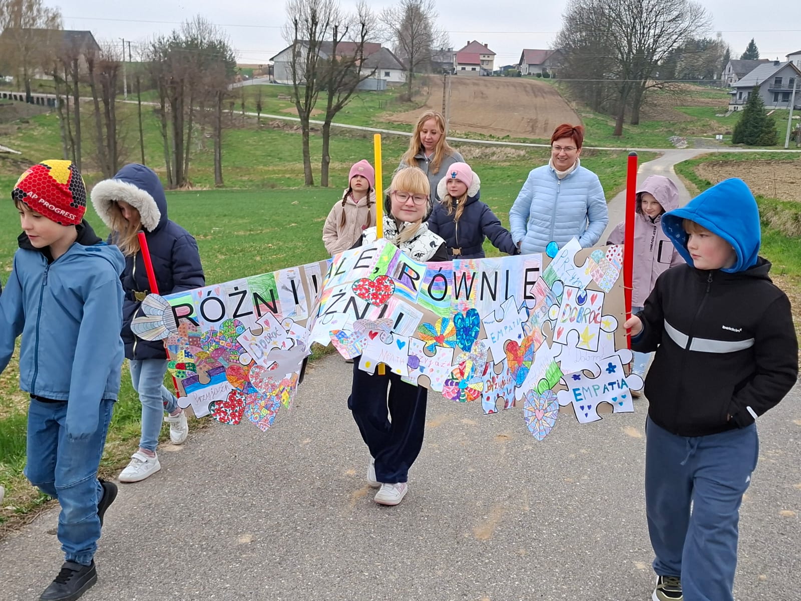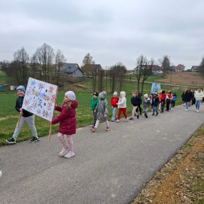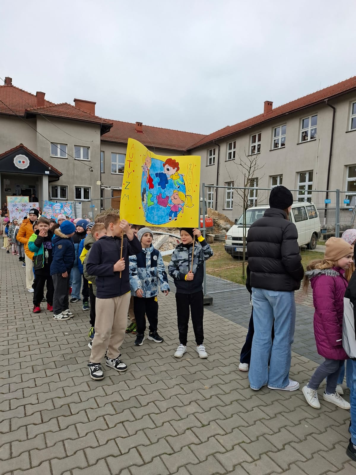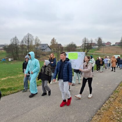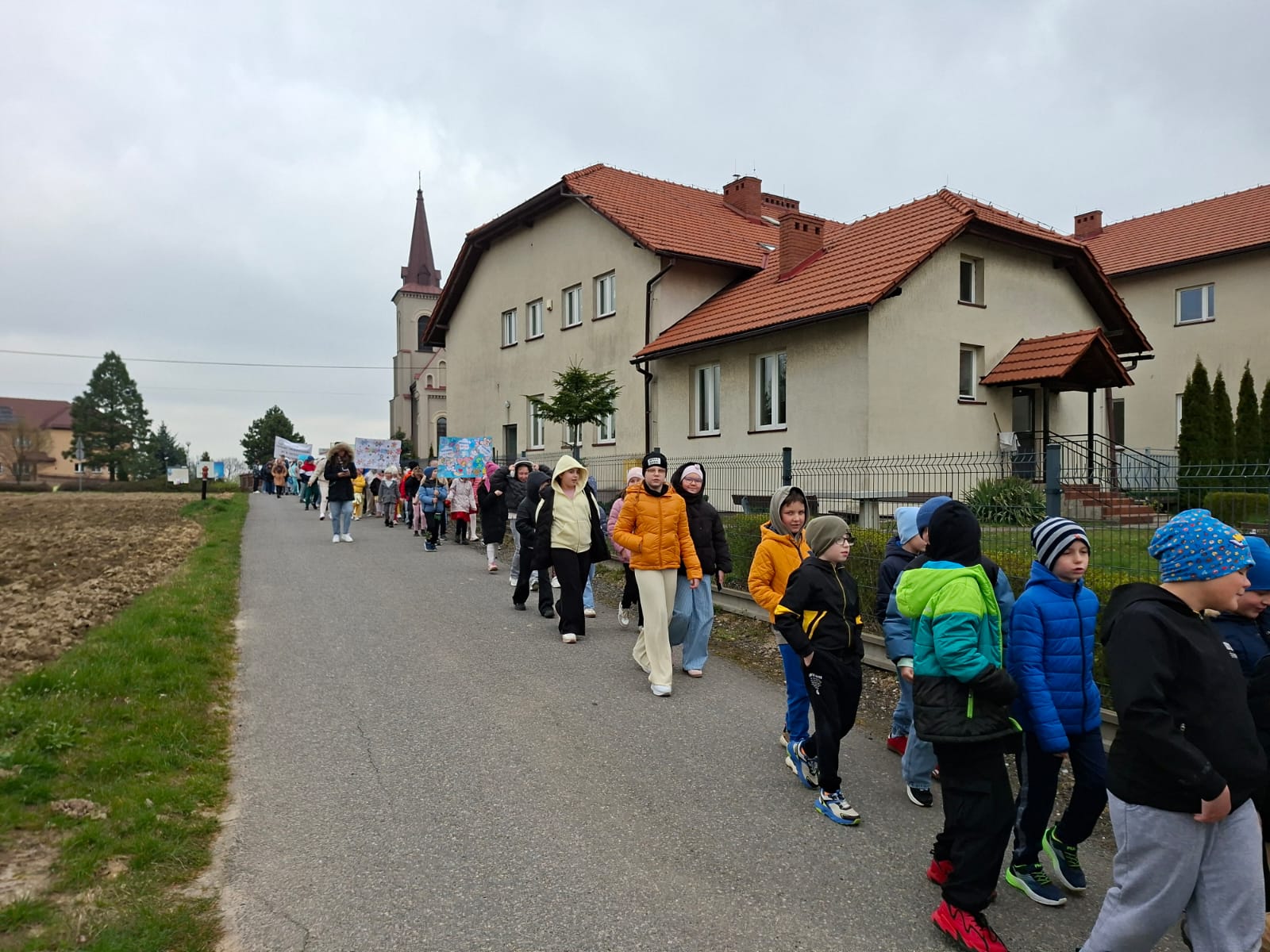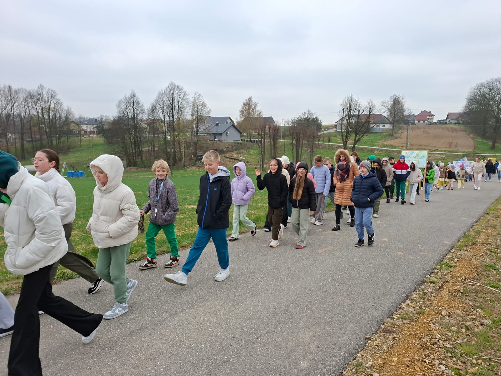 Po zakończeniu prac plastycznych cała społeczność szkolna wyruszyła na wspólny spacer po okolicy. Chcieliśmy w ten sposób pokazać nasze wsparcie i zwrócić uwagę mieszkańców na to, jak ważna jest otwartość na drugiego człowieka.