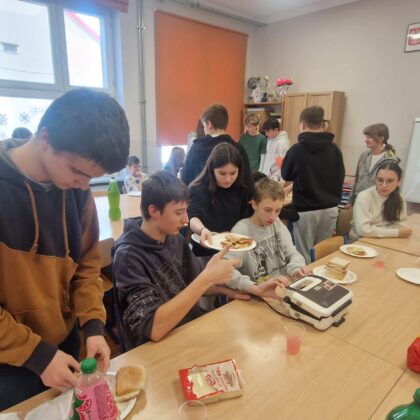 21 stycznia uczniowie klasy 8 wzięli udział w warsztatach w ramach projektu “Laboratoria przyszłości”. Wspólnie przygotowali tosty, które wszystkim bardzo smakowały. “Praktyczne z pożytecznym” to najlepszy sposób na realizację innowacyjnych lekcji.